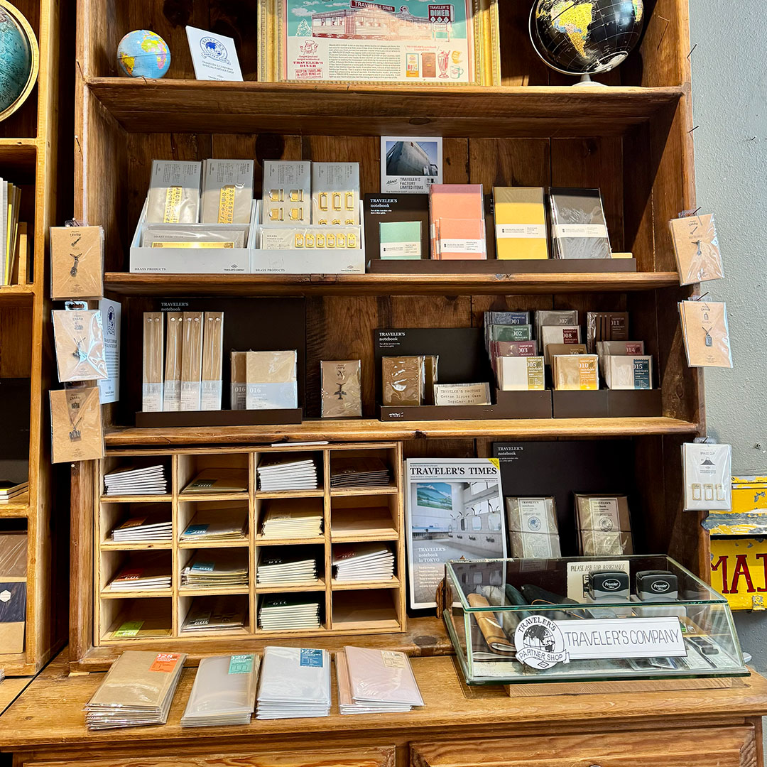 Inside the store, you’ll find aisles and aisles of shelving filled with a huge variety of inks, fountain pens, office supplies, and fine stationery. The TRAVELER’S COMPANY Stamp Caravan experience sits in the middle of the store on two sturdy tool tables; the furniture has been passed down through generations of use.
